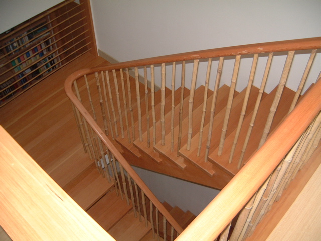 The three-story interior stair railing and screen is made of bamboo, fir and monofilament fiber. The fir handrail has some hand-carved turned sections crafted by David Stein, another local woodworker. The use of the three materials resulted in a light and striking work of art that is particularly effective at night in the soft light of the stairwell sconce from above. The fir handrail is acquiring a wonderful sheen as many hands pass over it and has proved to be durable as well as beautiful.